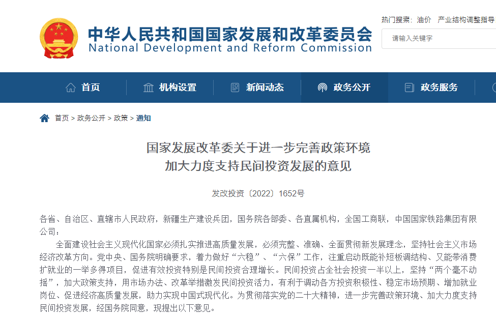 全面建設(shè)社會(huì)主義現(xiàn)代化國(guó)家必須扎實(shí)推進(jìn)高質(zhì)量發(fā)展,必須完整、準(zhǔn)確、全面貫徹新發(fā)展理念,堅(jiān)持社會(huì)主義市場(chǎng)經(jīng)濟(jì)改革方向。黨中央、國(guó)務(wù)院明確要求,著力做好“六穩(wěn)”、“六保”工作,注重啟動(dòng)既能補(bǔ)短板調(diào)結(jié)構(gòu)、又能帶消費(fèi)擴(kuò)就業(yè)的一舉多得項(xiàng)目,促進(jìn)有效投資特別是民間投資合理增長(zhǎng)。民間投資占全社會(huì)投資一半以上,堅(jiān)持“兩個(gè)毫不動(dòng)搖”,加大政策支持,用市場(chǎng)辦法、改革舉措激發(fā)民間投資活力,有利于調(diào)動(dòng)各方投資積極性、穩(wěn)定市場(chǎng)預(yù)期、增加就業(yè)崗位、促進(jìn)經(jīng)濟(jì)高質(zhì)量發(fā)展,助力實(shí)現(xiàn)中國(guó)式現(xiàn)代化。為貫徹落實(shí)黨的二十大精神,進(jìn)一步完善政策環(huán)境、加大力度支持民間投資發(fā)展,經(jīng)國(guó)務(wù)院同意,現(xiàn)提出以下意見(jiàn)。