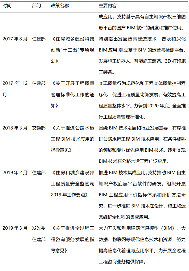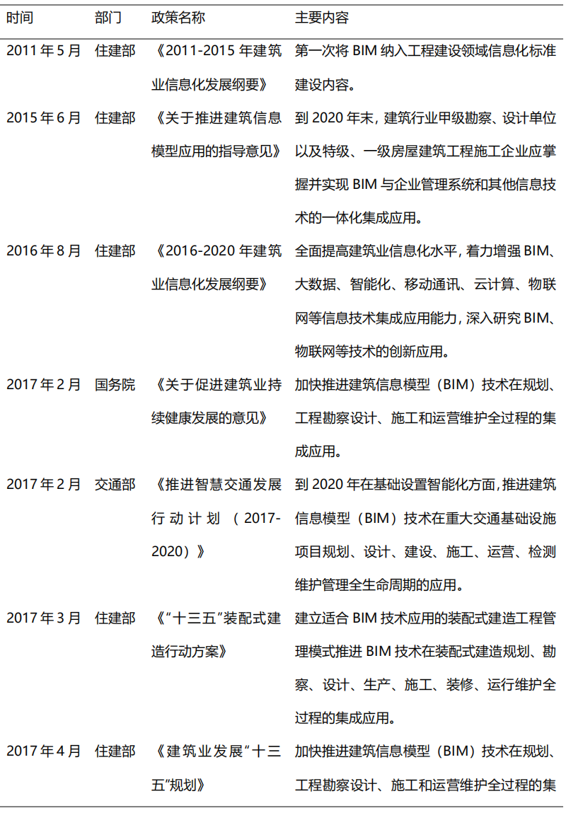隨著社會的發(fā)展,行業(yè)需求的轉(zhuǎn)變,加之國家和各地政府的扶持,建筑行業(yè)信息化、數(shù)據(jù)化、智能化趨勢不可逆轉(zhuǎn)。BIM勢必全面應(yīng)用到規(guī)劃、勘察、設(shè)計、施工和運(yùn)營維護(hù)中來,實現(xiàn)工程建設(shè)項目全生命周期數(shù)據(jù)共享和信息化管理。近年來,國務(wù)院、住建部等相關(guān)單位,頻繁頒發(fā)鼓勵和要求應(yīng)用BIM技術(shù)的指導(dǎo)意見,表1列出了國家層面的重要文件。