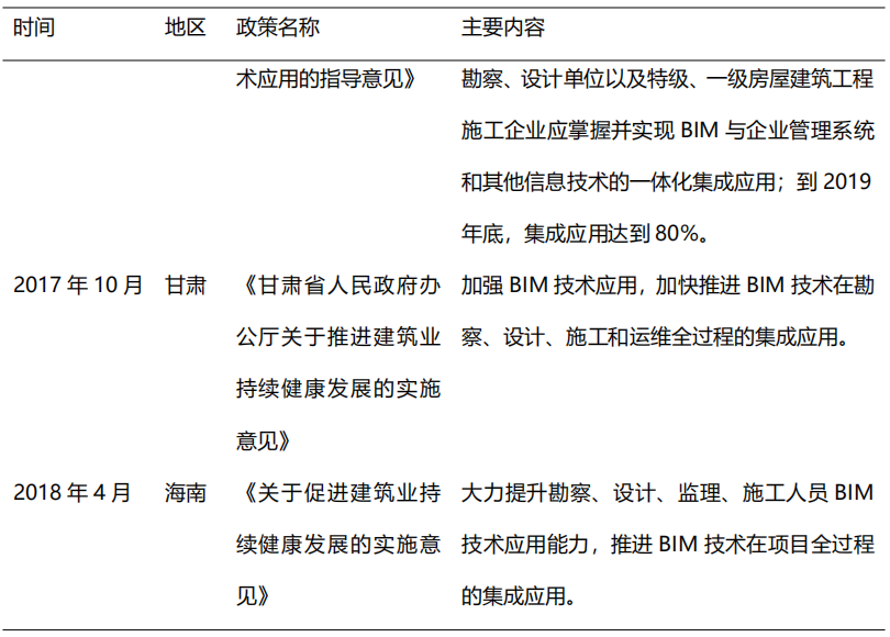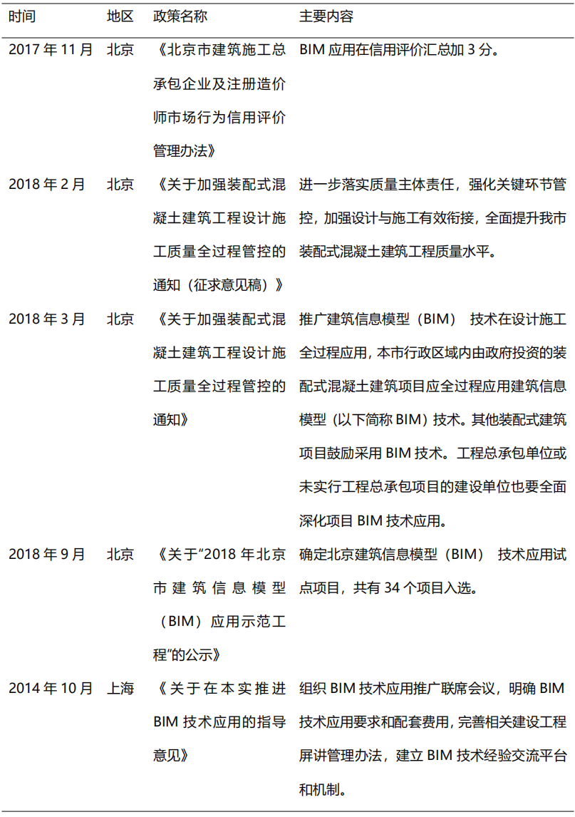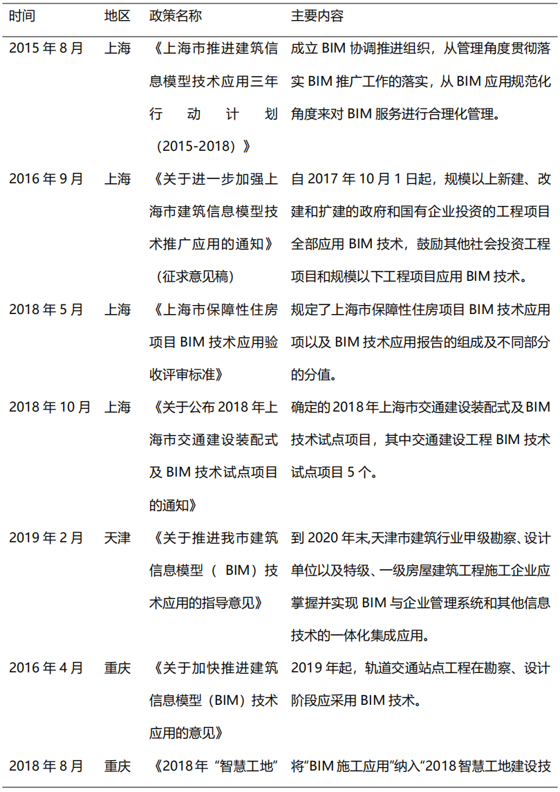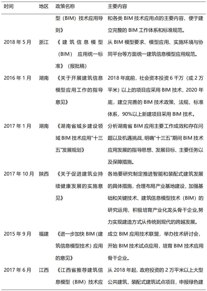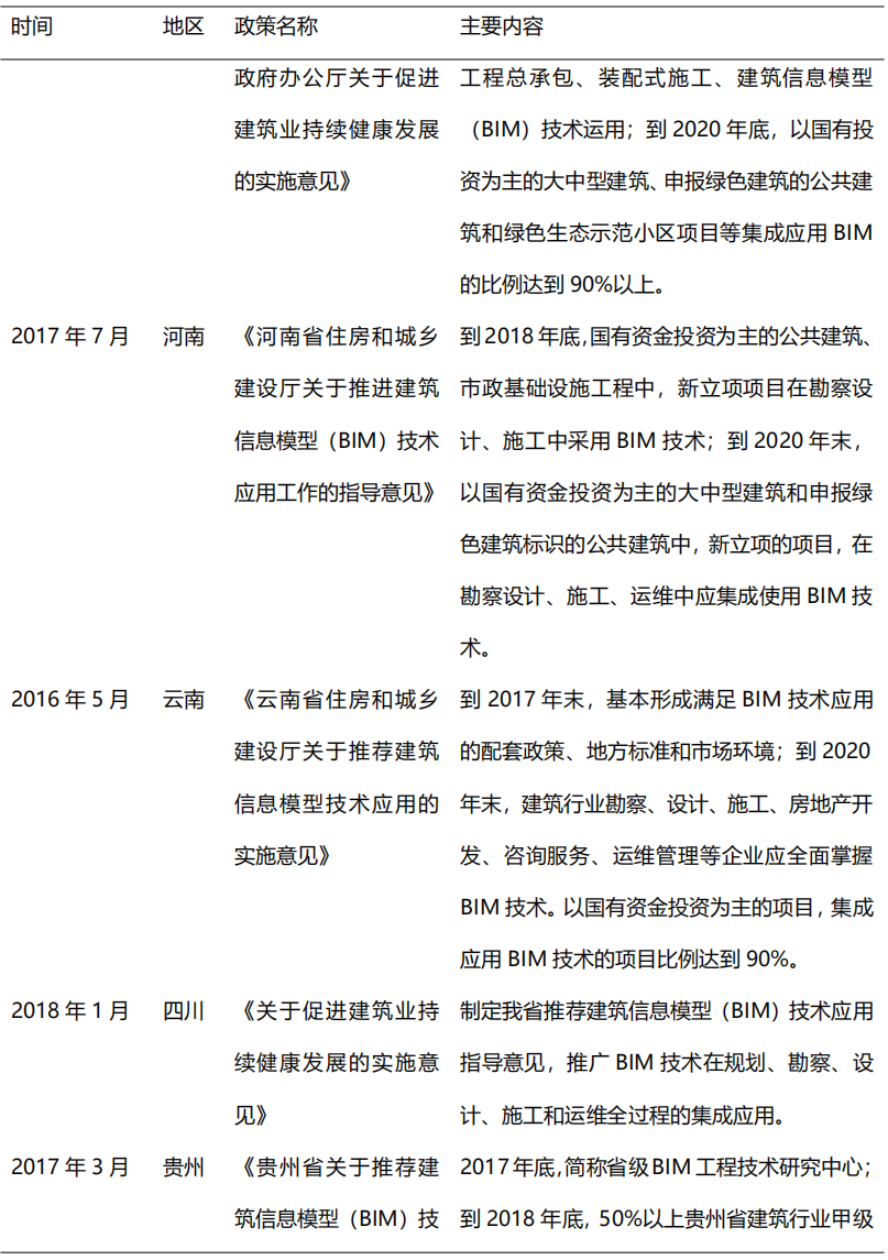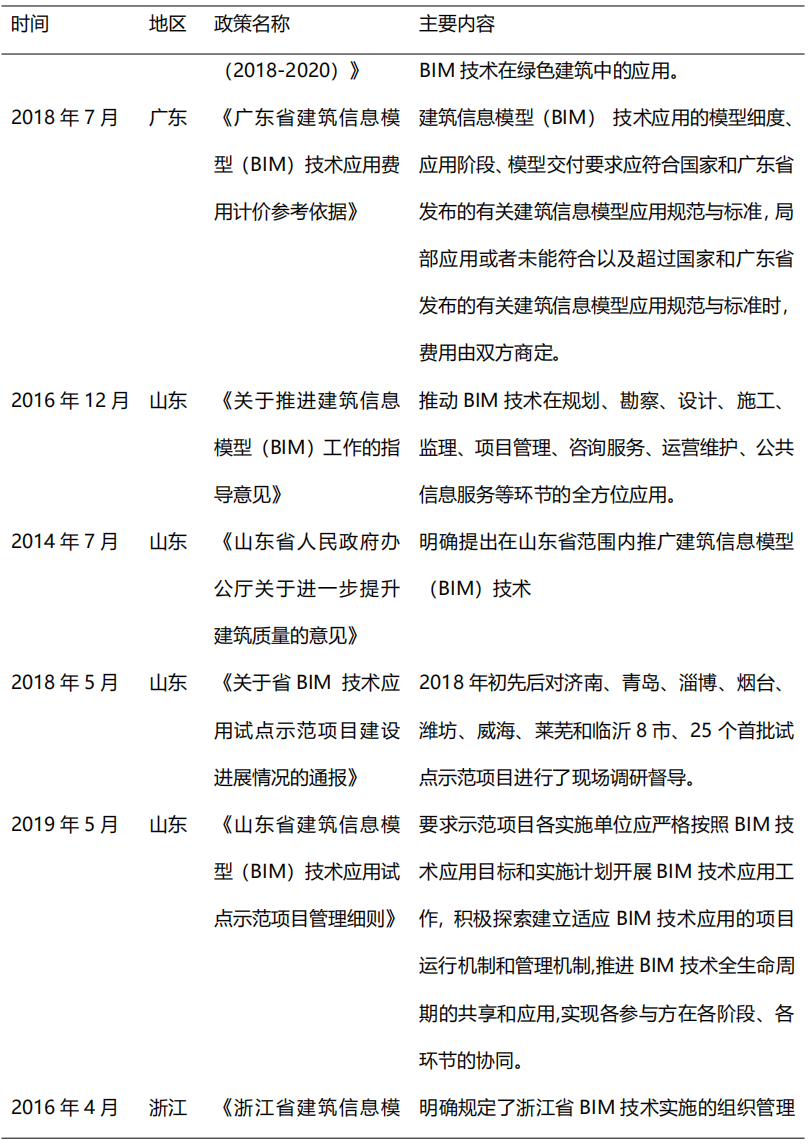 從2014年開始,在住建部的大力推動下,各省市政策相繼出臺BIM推廣應(yīng)用文件,到目前我國已初步形成BIM技術(shù)應(yīng)用標(biāo)準(zhǔn)和政策體系,為BIM的快速發(fā)展奠定了堅實的基礎(chǔ)。2017年,貴州、江西、河南等省市正式出臺BIM推廣意見,明確提出在省級范圍內(nèi)提出推廣BIM技術(shù)應(yīng)用。2018-2019年,各地政府對于BIM技術(shù)的重視程度不減,重慶、北京、吉林、深圳等多地政策出臺指導(dǎo)意見,旨在推動BIM技術(shù)進(jìn)一步應(yīng)用普及。隨著我國出臺BIM推廣意見的省市數(shù)量逐漸增多,全國BIM技術(shù)應(yīng)用推廣的范圍更加廣泛。表2列舉了部分重要地方鼓勵政策。