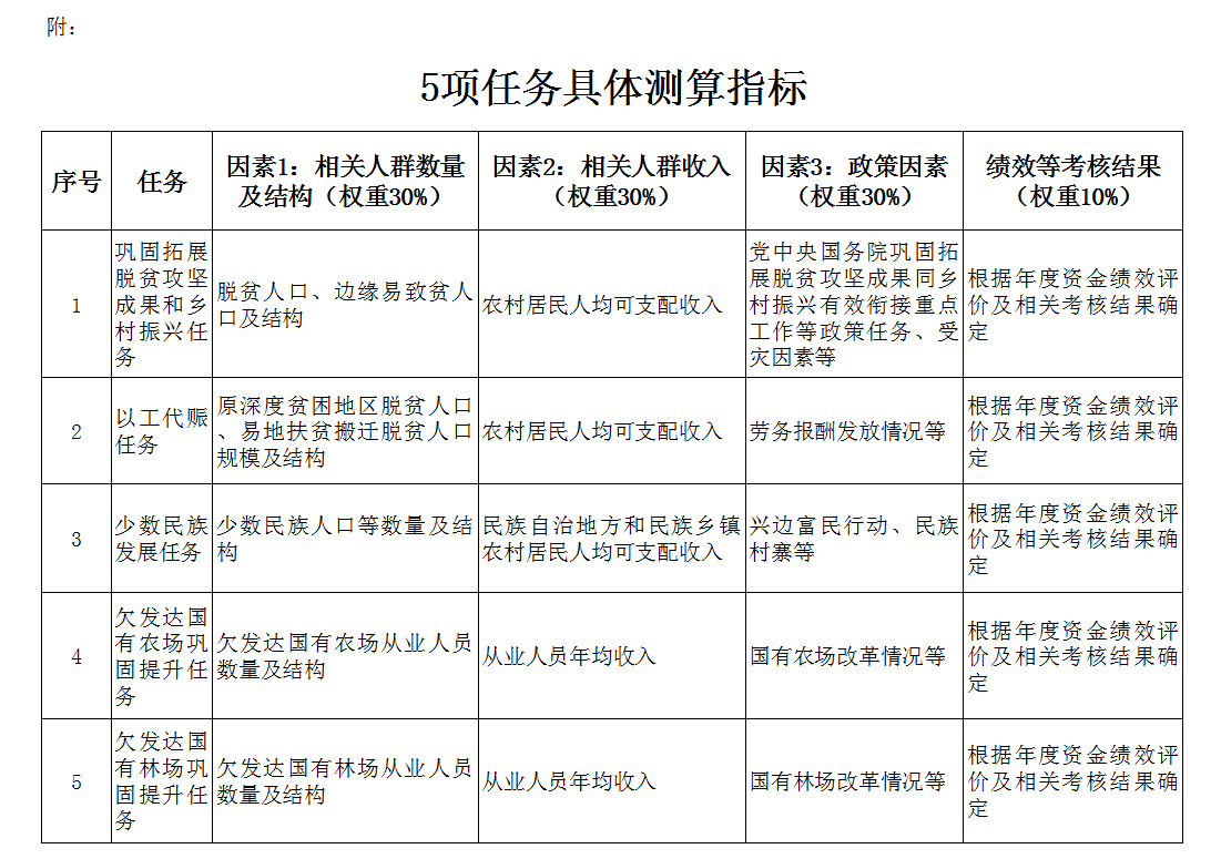 第二條 銜接資金按照鞏固拓展脫貧攻堅成果和鄉(xiāng)村振興、以工代賑、少數民族發(fā)展、欠發(fā)達國有農場鞏固提升、欠發(fā)達國有林場鞏固提升、“三西”農業(yè)建設任務進行分配。資金分配按照因素法進行測算,因素和權重為:相關人群數量及結構30%、相關人群收入30%、政策因素30%、績效等考核結果10%,并進行綜合平衡。各項任務按照上述因素分別確定具體測算指標(詳見附件)?!叭鳌鞭r業(yè)建設任務按照國務院批準的規(guī)模安排。