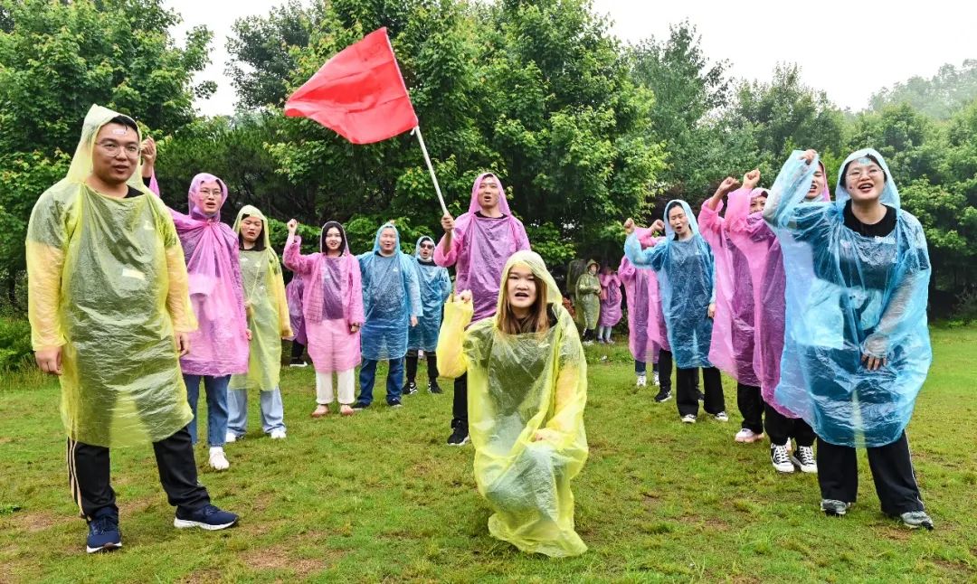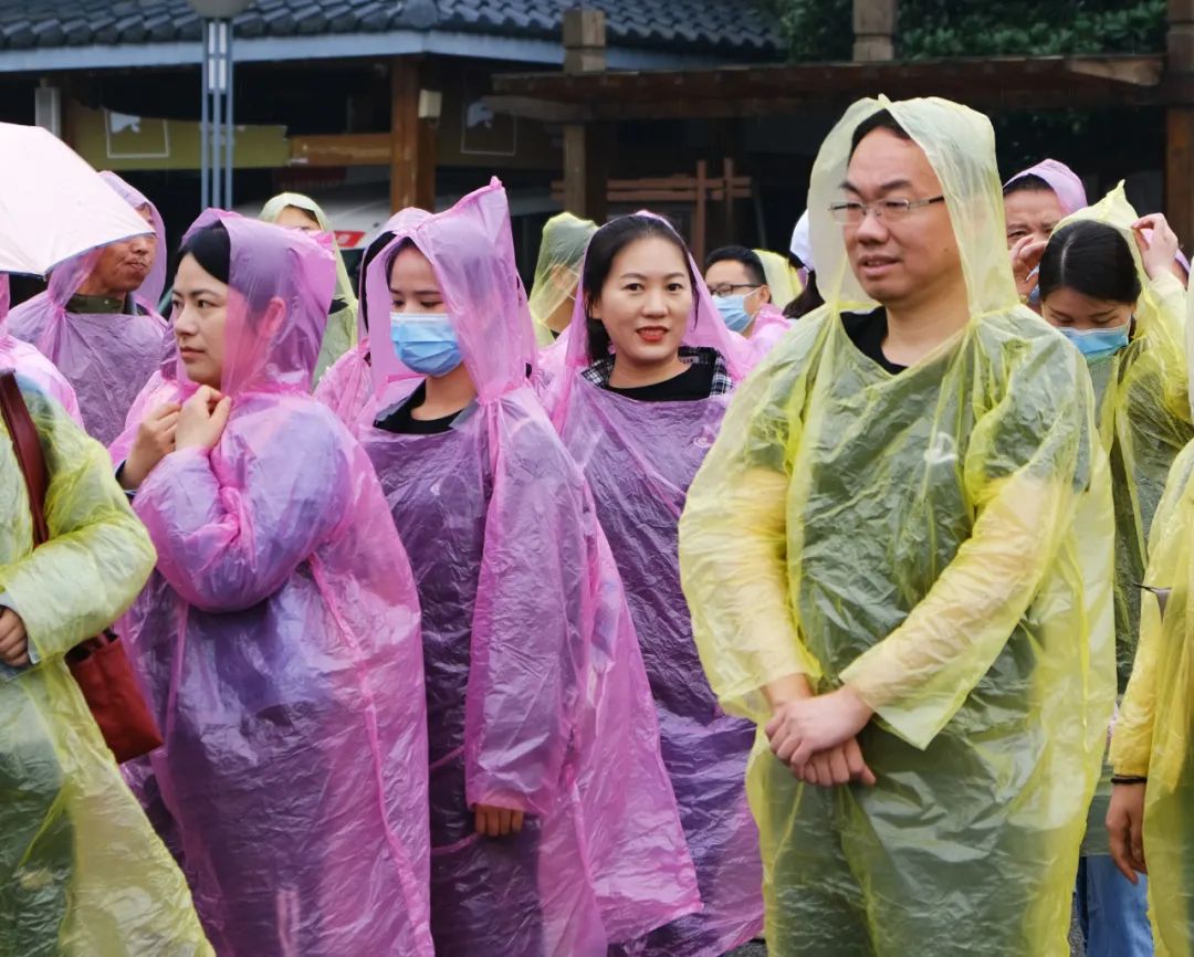 活動當(dāng)天雖當(dāng)天上午持續(xù)陰雨連綿,但是出游的同事們并未停下腳步,路途大巴上交談甚歡載歌載舞,欣喜之情溢于言表,穿上花花綠綠的雨衣在雨霧中穿行,在東湖磨山水墨畫一般的景色中劃出一條彩色的長線,亦是一道別樣的風(fēng)景。
