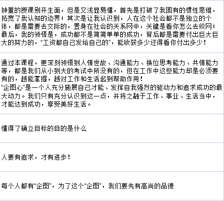 開堂的第一節(jié)課,他以《打開企圖心》為主題,以提問(wèn)為主的方式,激發(fā)線上線下的學(xué)員深入思考:我們?yōu)楹味鴬^斗?我們因何而得到?既不是秀才(編者注:此語(yǔ)境下的含義為生活優(yōu)渥者)也不是落榜者(編者注:此語(yǔ)境下的含義為因失敗而發(fā)憤圖強(qiáng)者)的我們又當(dāng)以什么作為自身前進(jìn)的動(dòng)力?……