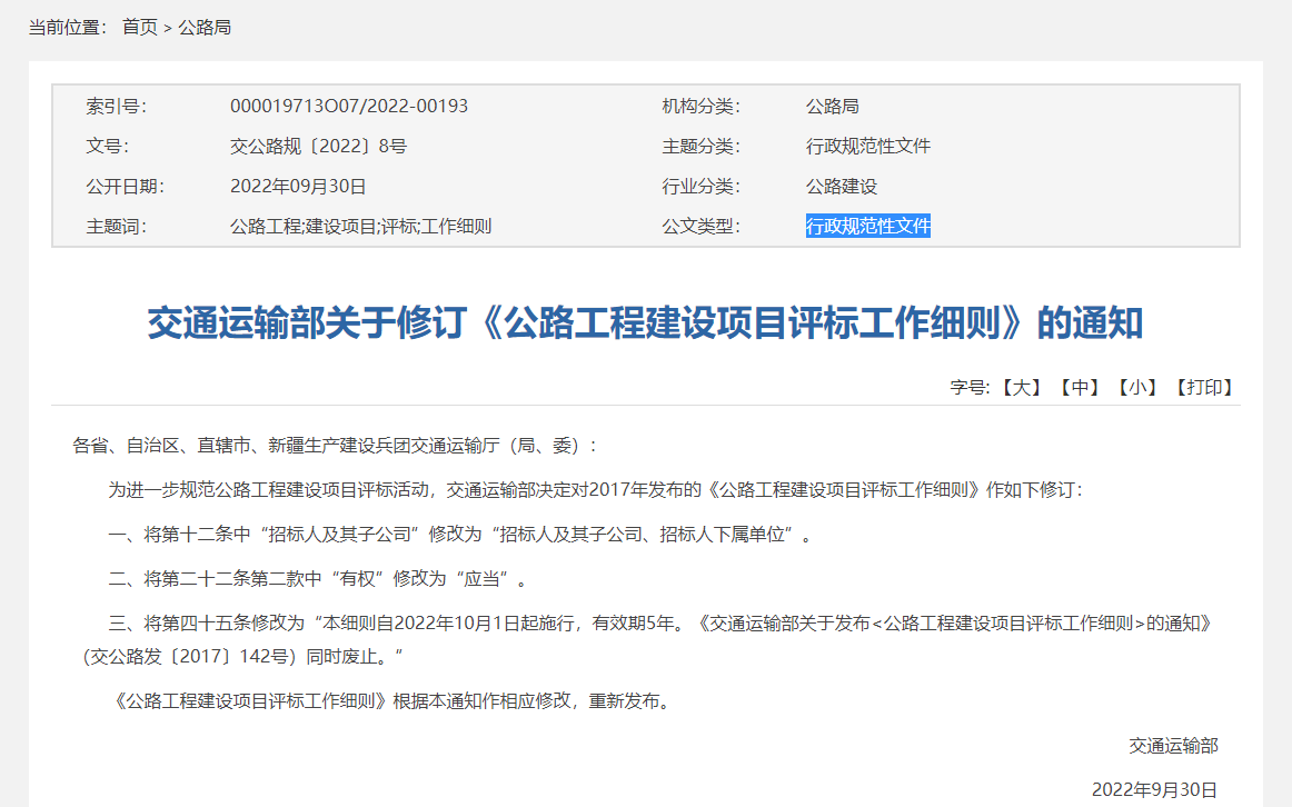 為進(jìn)一步規(guī)范公路工程建設(shè)項(xiàng)目評(píng)標(biāo)工作活動(dòng),結(jié)合2017年發(fā)布的《公路工程建設(shè)項(xiàng)目評(píng)標(biāo)工作細(xì)則》執(zhí)行情況,并與近期發(fā)布的有關(guān)文件規(guī)定保持一致,對(duì)原細(xì)則個(gè)別條款進(jìn)行了修訂。主要內(nèi)容:一是將第十二條中“招標(biāo)人及其子公司”修改為“招標(biāo)人及其子公司、招標(biāo)人下屬單位”。二是將第二十二條第二款中“有權(quán)”修改為“應(yīng)當(dāng)”。三是將第四十五條修改為:“本細(xì)則自2022年10月1日起施行,有效期5年?!督煌ㄟ\(yùn)輸部關(guān)于發(fā)布<公路工程建設(shè)項(xiàng)目評(píng)標(biāo)工作細(xì)則的通知>》(交公路發(fā)〔2017〕142號(hào))同時(shí)廢止?!?/span>