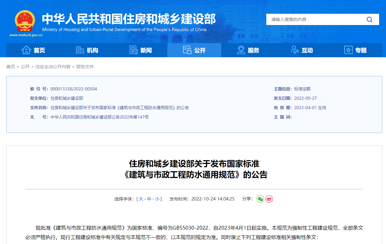 10月24日,住建部發(fā)布國(guó)家標(biāo)準(zhǔn)《建筑與市政工程防水通用規(guī)范》的公告。現(xiàn)批準(zhǔn)《建筑與市政工程防水通用規(guī)范》為國(guó)家標(biāo)準(zhǔn),編號(hào)為GB55030-2022,自2023年4月1日起實(shí)施。本規(guī)范為強(qiáng)制性工程建設(shè)規(guī)范,全部條文必須嚴(yán)格執(zhí)行?,F(xiàn)行工程建設(shè)標(biāo)準(zhǔn)中有關(guān)規(guī)定與本規(guī)范不一致的,以本規(guī)范的規(guī)定為準(zhǔn)。