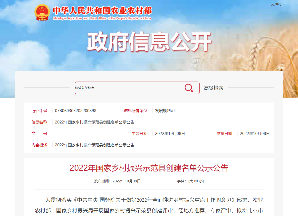 農(nóng)業(yè)農(nóng)村部、國(guó)家鄉(xiāng)村振興局開(kāi)展國(guó)家鄉(xiāng)村振興示范縣創(chuàng)建評(píng)審,經(jīng)地方推薦、專家評(píng)審,擬將北京市大興區(qū)等100個(gè)申報(bào)單位納入2022年國(guó)家鄉(xiāng)村振興示范縣創(chuàng)建名單,湖北省4地入圍。