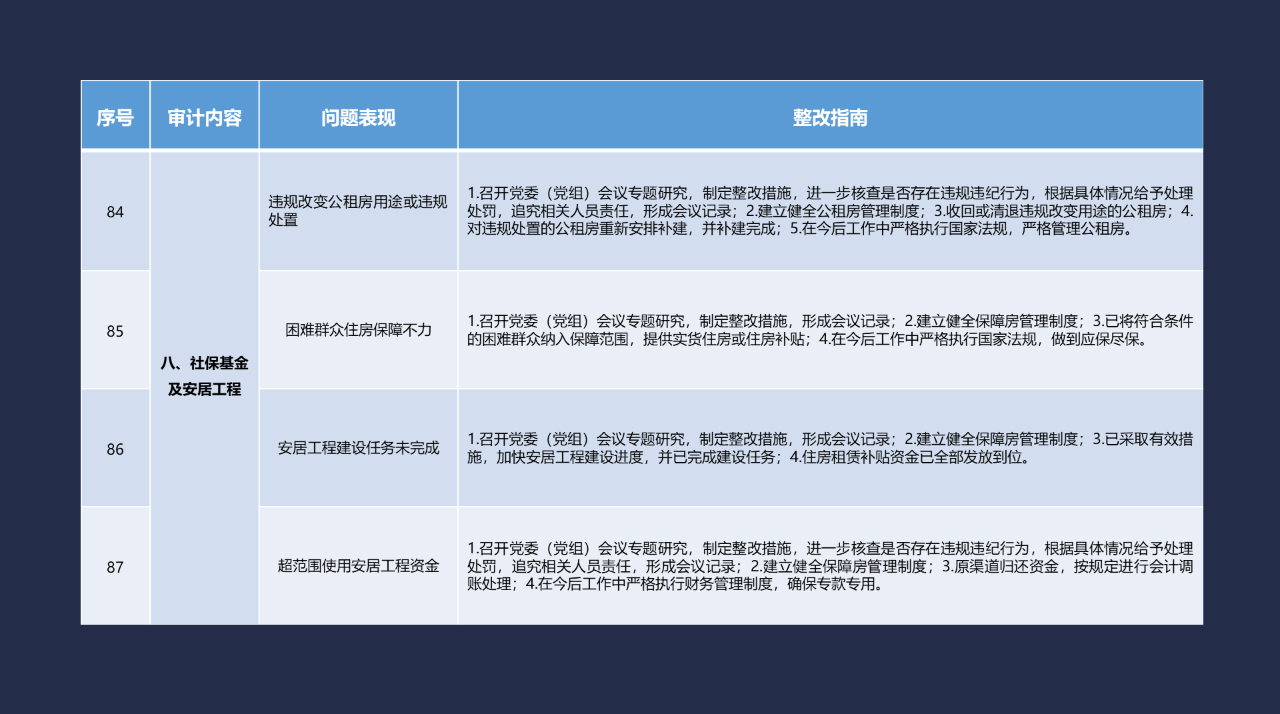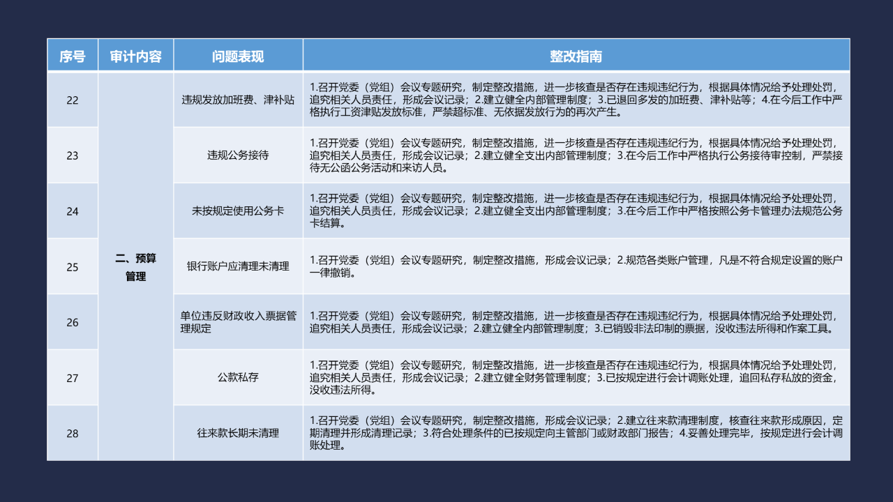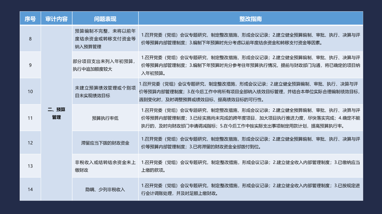 《整改指南100條》按照常見的重大政策措施落實、預(yù)算管理、政府采購及招投標、基本建設(shè)、內(nèi)控管理、企業(yè)管理、自然資源、社保資金及安居工程、金融管理、國外貸援款共10類審計內(nèi)容進行問題分類,列舉了100個常見問題并給出相對應(yīng)的整改方法說明,供審計機關(guān)和整改責(zé)任單位在審計整改工作中參照落實。