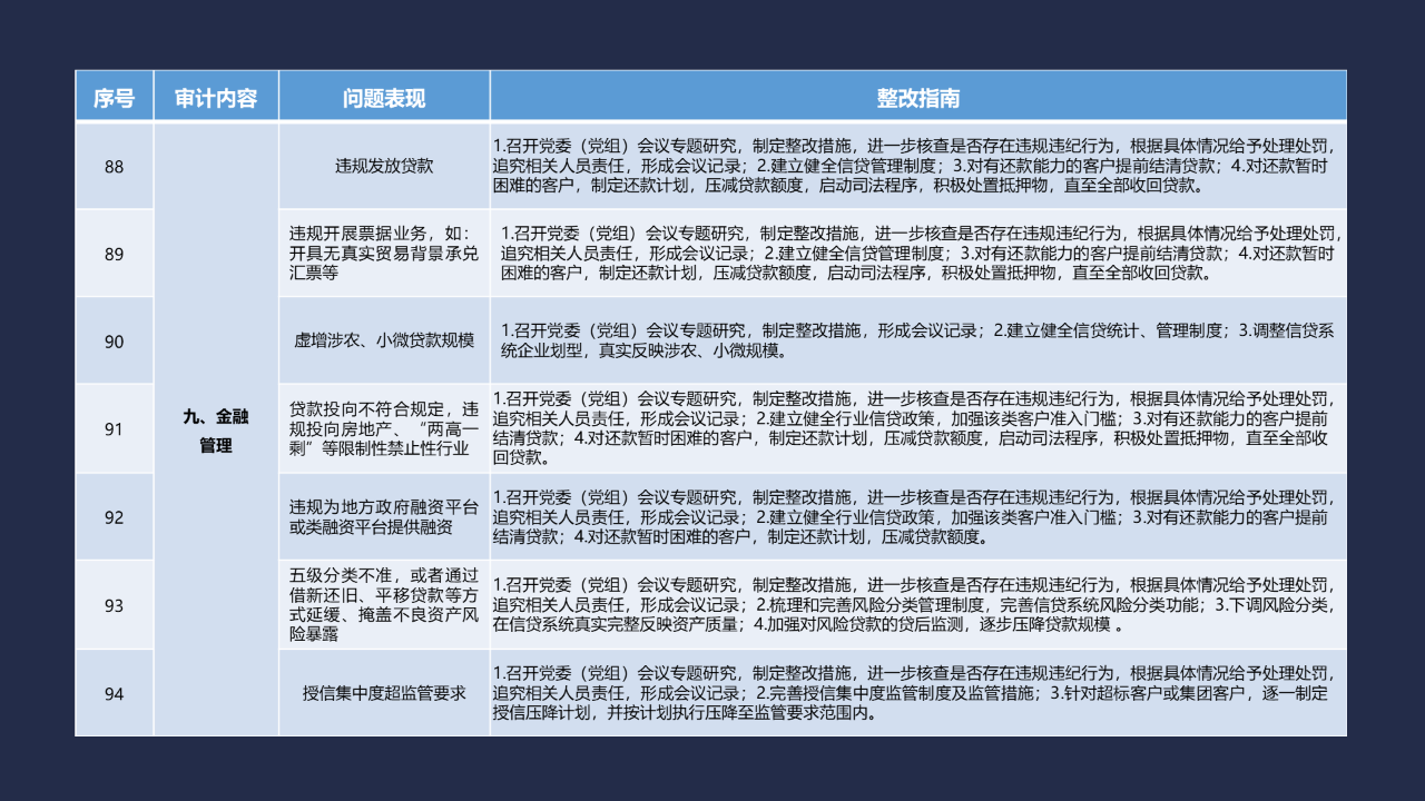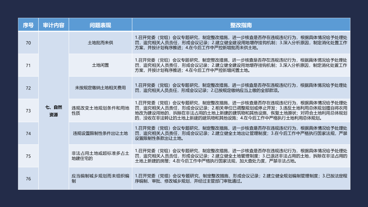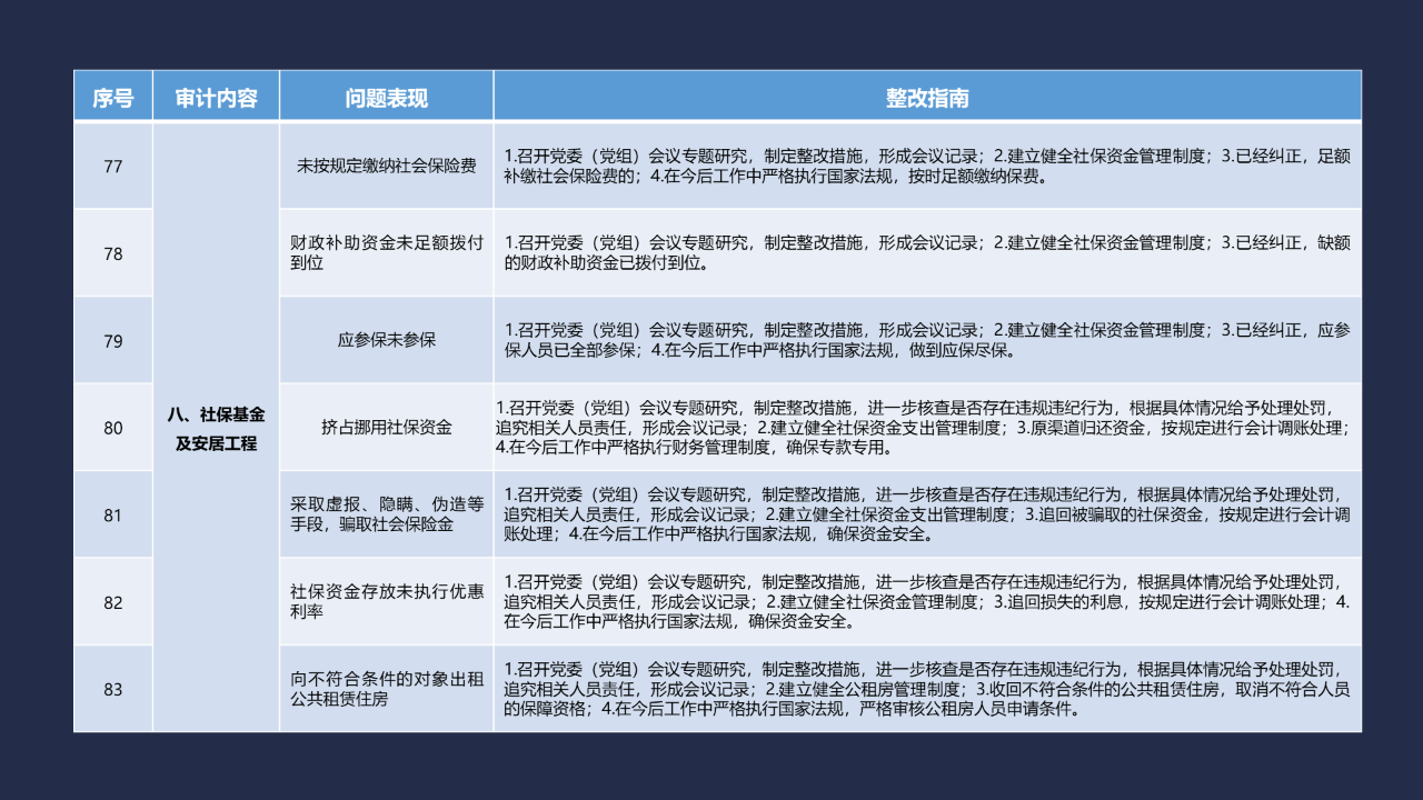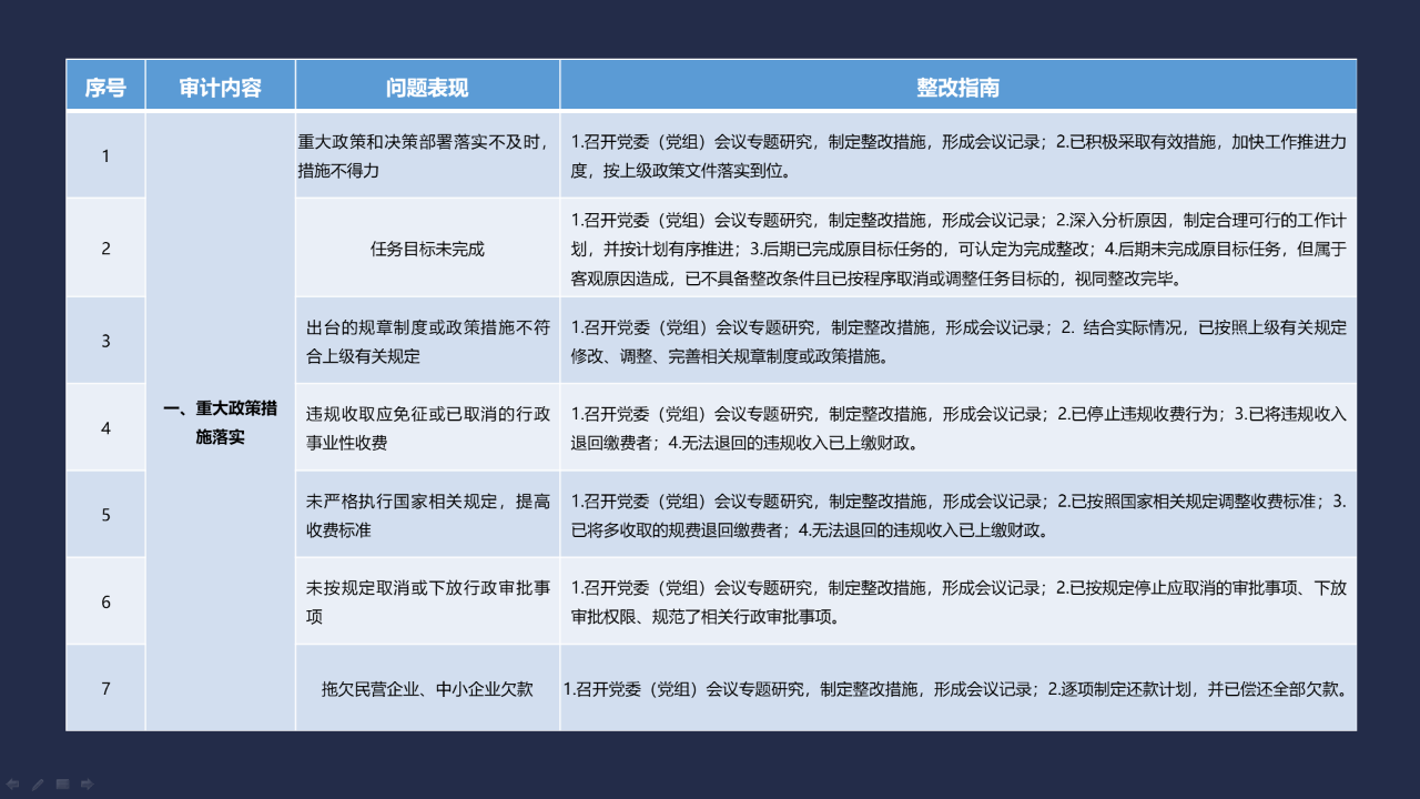 《整改指南100條》按照常見的重大政策措施落實、預(yù)算管理、政府采購及招投標、基本建設(shè)、內(nèi)控管理、企業(yè)管理、自然資源、社保資金及安居工程、金融管理、國外貸援款共10類審計內(nèi)容進行問題分類,列舉了100個常見問題并給出相對應(yīng)的整改方法說明,供審計機關(guān)和整改責(zé)任單位在審計整改工作中參照落實。