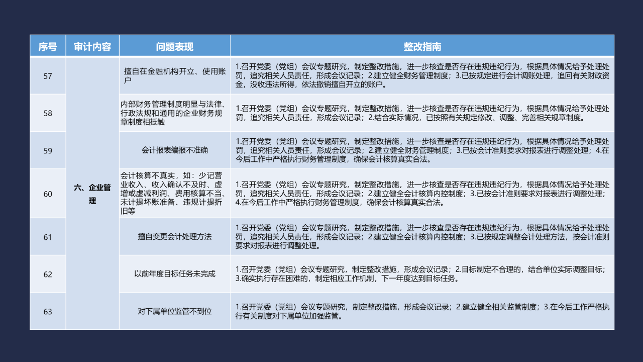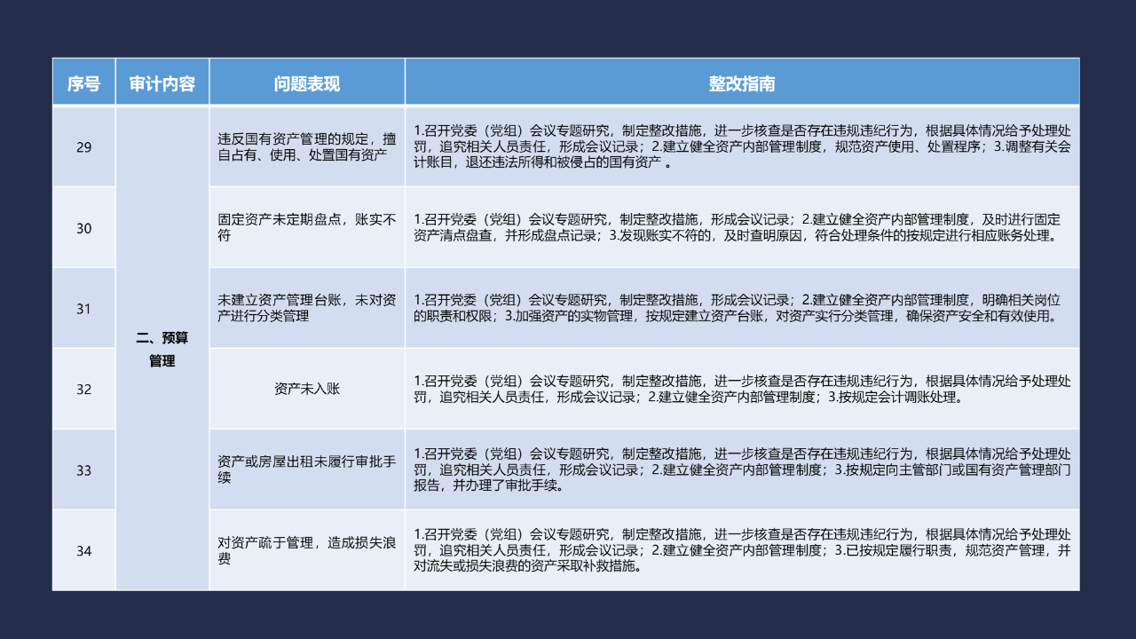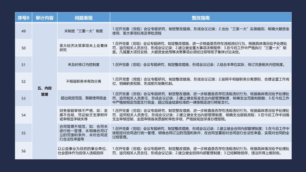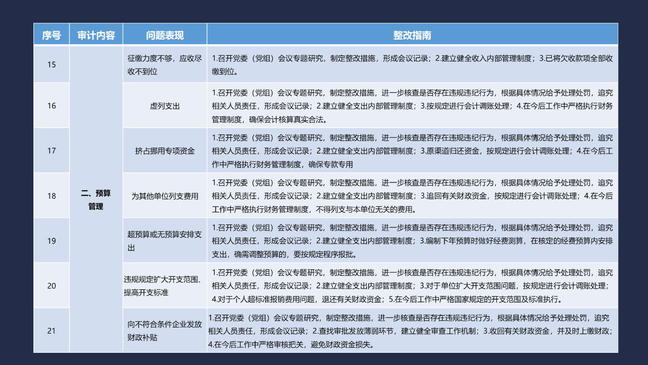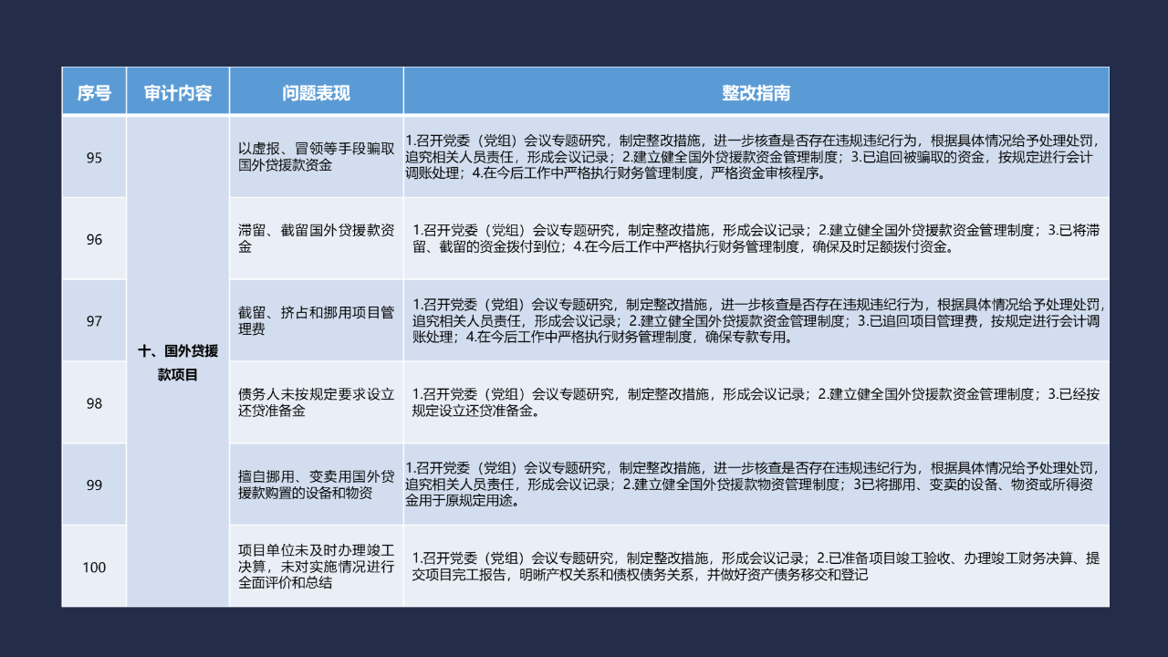 《整改指南100條》僅對審計整改的認定提供一般參考,每個問題的具體整改要求由審計機關(guān)在此基礎(chǔ)上依據(jù)審計事實、問題情節(jié)、產(chǎn)生后果,在審計報告及所附的《審計發(fā)現(xiàn)問題清單》中予以明確。涉及上級審計查出問題的整改情況按照上級審計機關(guān)有關(guān)要求進行落實。