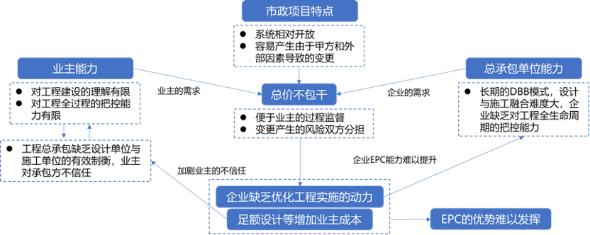 簡言之,市政項目的特點、業(yè)主和總承包單位的能力導(dǎo)致了市政工程項目是總價不包干的,而這使得總承包單位缺乏優(yōu)化設(shè)計施工融合的動力,甚至使得總承包單位進行設(shè)計與施工的畸形融合。而這一方面使得業(yè)主對推行工程總承包興趣缺失甚至存在抵觸,對總承包單位的管理能力建設(shè)遲緩,另一方面也使得總承包單位的工程總承包能力建設(shè)推進緩慢,而這又進一步固化了總價不包干的模式,從而使得工程總承包的優(yōu)勢難以發(fā)揮,由此,工程總承包推進艱難。