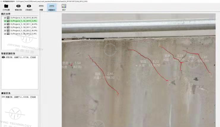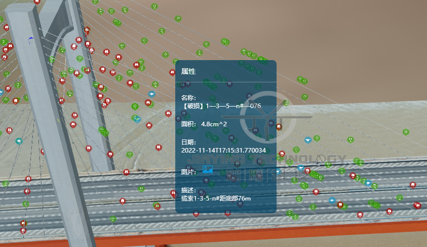 對于斜拉索橋,其受力模式較為復(fù)雜,多個(gè)關(guān)鍵部位均有可能產(chǎn)生受力裂縫或其他病害。珈鷹利用自主研發(fā)的智能識別測量軟件對已采集的高清圖像進(jìn)行智能、高效處理,精準(zhǔn)定位受損位置,捕捉病害。