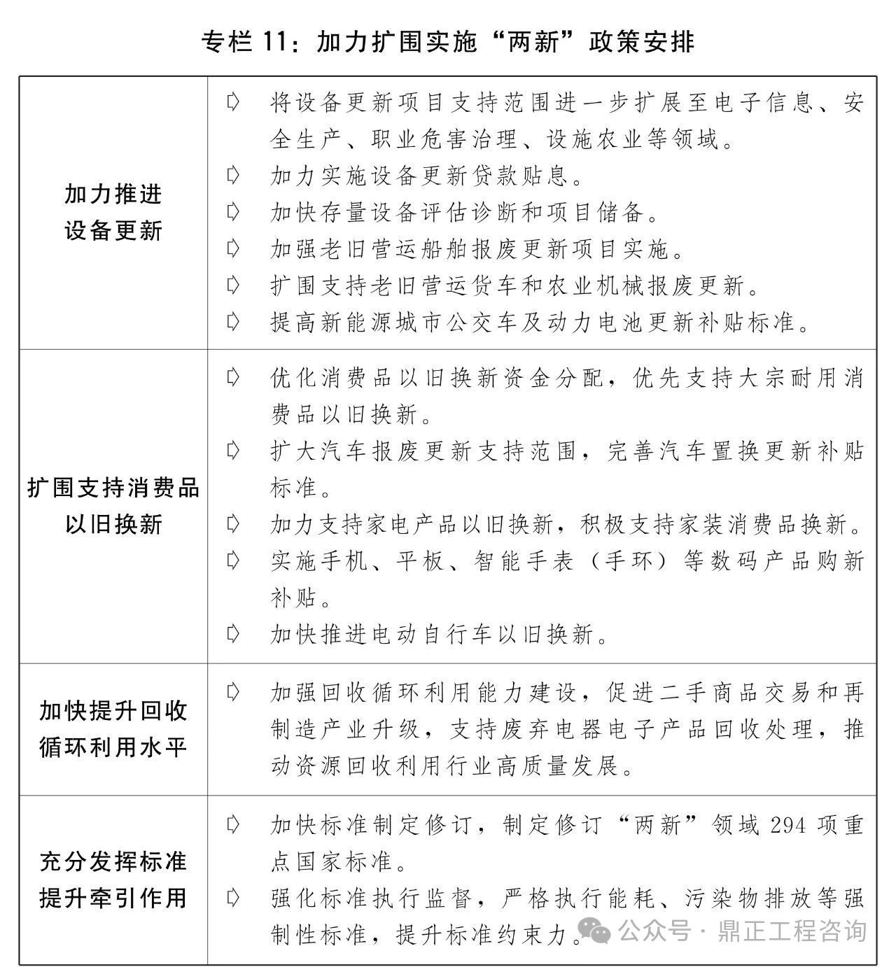 安排超長(zhǎng)期特別國(guó)債5000億元支持大規(guī)模設(shè)備更新和消費(fèi)品以舊換新,統(tǒng)籌投資、財(cái)政、金融等綜合性政策,深入推進(jìn)設(shè)備更新、消費(fèi)品以舊換新、回收循環(huán)利用、標(biāo)準(zhǔn)提升四大行動(dòng)。進(jìn)一步加大重點(diǎn)領(lǐng)域設(shè)備更新項(xiàng)目支持力度,加力實(shí)施設(shè)備更新貸款貼息,加快存量設(shè)備評(píng)估診斷和項(xiàng)目?jī)?chǔ)備。進(jìn)一步支持消費(fèi)品以舊換新,擴(kuò)大汽車報(bào)廢更新支持范圍,完善汽車置換更新補(bǔ)貼標(biāo)準(zhǔn),實(shí)施手機(jī)、平板等數(shù)碼產(chǎn)品購(gòu)新補(bǔ)貼,積極支持家裝消費(fèi)品換新,簡(jiǎn)化補(bǔ)貼申領(lǐng)和支付流程,完善資金監(jiān)管機(jī)制,嚴(yán)厲打擊價(jià)格欺詐和違規(guī)騙補(bǔ)套補(bǔ)行為。