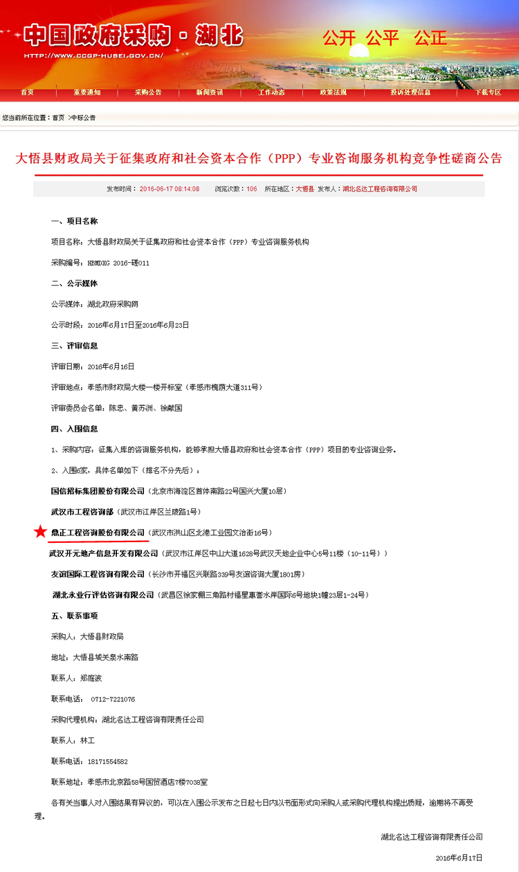 【經(jīng)營(yíng)成果】我司入圍大悟縣財(cái)政局關(guān)于征集政府和社會(huì)資本合作(PPP)專業(yè)咨詢服務(wù)機(jī)構(gòu)