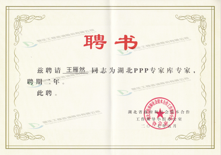 ,我司王雁然先生、朱立冬教授、張宏亮先生已入選湖北省財政廳PPP專家?guī)鞂<?,另外,王雁然先生還被崇陽縣人民政府聘為崇陽縣PPP項目專家顧問。