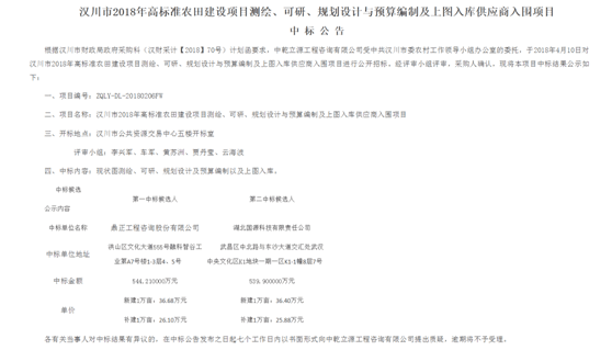 2018年4月11日,我司中標(biāo)“漢川市2018年高標(biāo)準(zhǔn)農(nóng)田項(xiàng)目”,該項(xiàng)目位于湖北省漢川市,項(xiàng)目規(guī)模約17萬(wàn)畝,對(duì)漢川市2018年高標(biāo)準(zhǔn)農(nóng)田建設(shè)項(xiàng)目進(jìn)行測(cè)繪、可行性研究、規(guī)劃設(shè)計(jì)與預(yù)算編制,中標(biāo)金額為544.21萬(wàn)元,中標(biāo)單價(jià)為新建1萬(wàn)畝(36.68萬(wàn)元)和補(bǔ)建一萬(wàn)畝(26.10萬(wàn)元)。