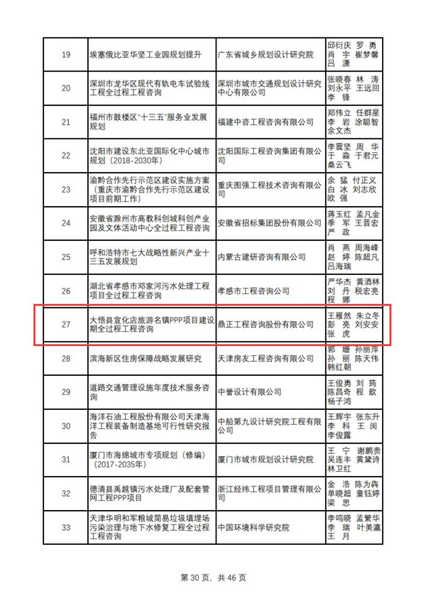 2019年12月27日,中國工程咨詢協(xié)會公布了“2018年度全國優(yōu)秀工程咨詢成果獎”獲獎項(xiàng)目名單,由鼎正咨詢獨(dú)立編制完成的《大悟縣宣化店旅游名鎮(zhèn)建設(shè)PPP項(xiàng)目全過程工程咨詢報(bào)告》榮獲全國優(yōu)秀工程咨詢成果三等獎!
